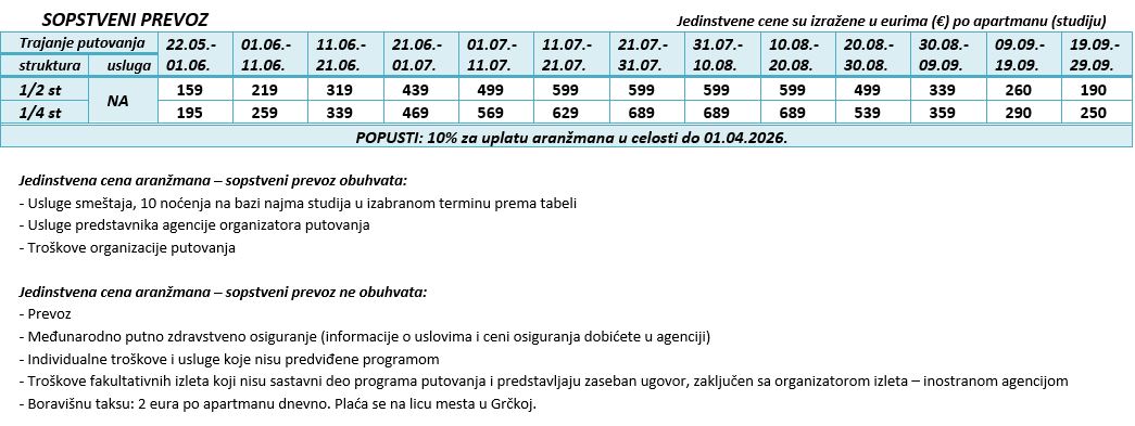 VAŽNO: Ministarstvo turizma Republike Grčke je najavilo uvođenje boravišne takse (turističke takse) od 01.01.2025. godine. Boravišna taksa u studijima/apartmanima iznosiće 2 eur dnevno po smeštajnoj jedinici i naplaćivaće je na licu mesta vlasnici smeštajnog objekta. Cene, doplate i uslovi prodaje su na sajtu čisto informativnog karaktera za sve informacije proverite zvaničan program putovanja Grčka – leto – 2026 – Halkidiki.