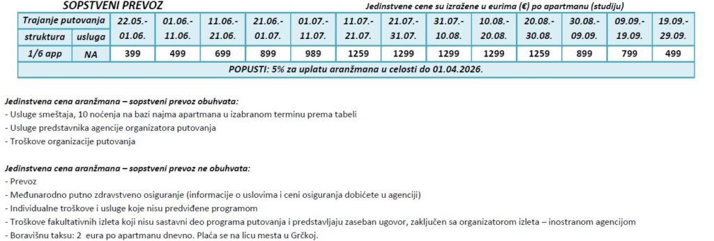 VAŽNO: Ministarstvo turizma Republike Grčke je najavilo uvođenje boravišne takse (turističke takse) od 01.01.2025. godine. Boravišna taksa u studijima/apartmanima iznosiće 2 eur dnevno po smeštajnoj jedinici i naplaćivaće je na licu mesta vlasnici smeštajnog objekta. Cene, doplate i uslovi prodaje su na sajtu čisto informativnog karaktera za sve informacije proverite zvaničan program putovanja Grčka – leto – 2026 – Halkidiki.