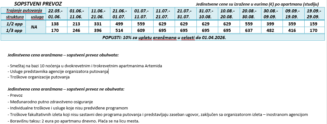 - Polazak je jedan dan ranije u odnosu na termine iz tabele.