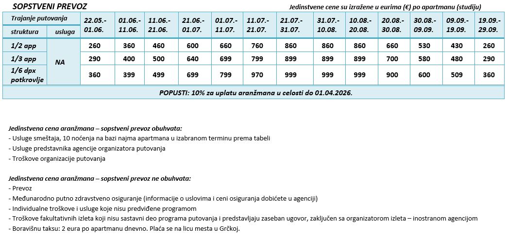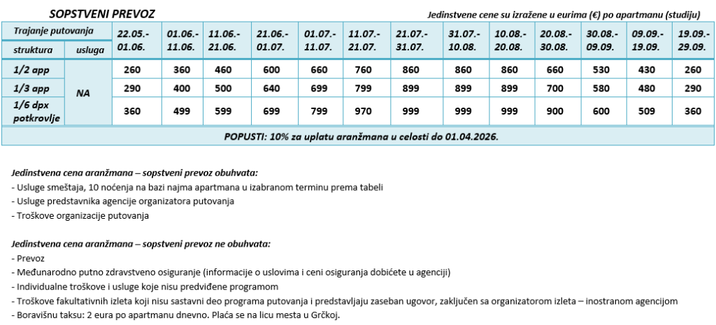 VAŽNO: Ministarstvo turizma Republike Grčke je najavilo uvođenje boravišne takse (turističke takse) od 01.01.2025. godine. Boravišna taksa u studijima/apartmanima iznosiće 2 eur dnevno po smeštajnoj jedinici i naplaćivaće je na licu mesta vlasnici smeštajnog objekta. Cene, doplate i uslovi prodaje su na sajtu čisto informativnog karaktera za sve informacije proverite zvaničan program putovanja Grčka – leto – 2026 – Halkidiki.