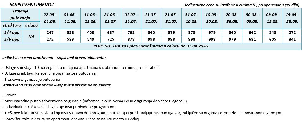 VAŽNO: Ministarstvo turizma Republike Grčke je najavilo uvođenje boravišne takse (turističke takse) od 01.01.2025. godine. Boravišna taksa u studijima/apartmanima iznosiće 2 eur dnevno po smeštajnoj jedinici i naplaćivaće je na licu mesta vlasnici smeštajnog objekta. Cene, doplate i uslovi prodaje su na sajtu čisto informativnog karaktera za sve informacije proverite zvaničan program putovanja Grčka – leto – 2026 – Halkidiki.