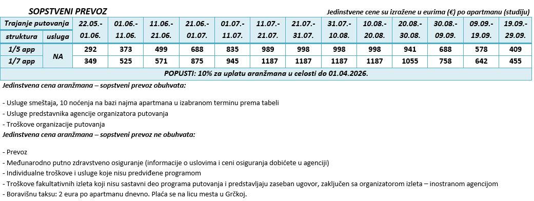 VAŽNO: Ministarstvo turizma Republike Grčke je najavilo uvođenje boravišne takse (turističke takse) od 01.01.2025. godine. Boravišna taksa u studijima/apartmanima iznosiće 2 eur dnevno po smeštajnoj jedinici i naplaćivaće je na licu mesta vlasnici smeštajnog objekta. Cene, doplate i uslovi prodaje su na sajtu čisto informativnog karaktera za sve informacije proverite zvaničan program putovanja Grčka – leto – 2026 – Halkidiki.