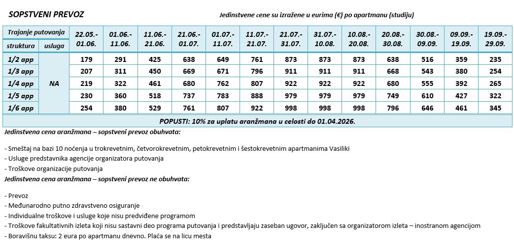 VAŽNO: Ministarstvo turizma Republike Grčke je najavilo uvođenje boravišne takse (turističke takse) od 01.01.2025. godine. Boravišna taksa u studijima/apartmanima iznosiće 2 eur dnevno po smeštajnoj jedinici i naplaćivaće je na licu mesta vlasnici smeštajnog objekta. Cene, doplate i uslovi prodaje su na sajtu čisto informativnog karaktera za sve informacije proverite zvaničan program putovanja Grčka – leto – 2026 – Halkidiki.