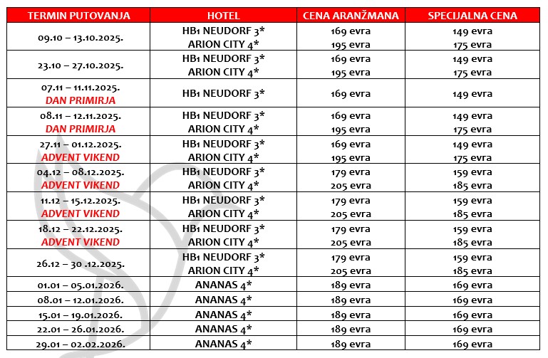 Polazak iz Beograda u 22h sa glavne autobuske stanice BAS, blok 42, ulaz iz ulice Antifašističkih borbi br 46-48, sa perona od 57 do 63 koji su predviđeni za polazak turističkih autobusa (detaljnije informacije o polasku: tačan broj perona, naziv prevoznika, kontakt vodiča, biće poznate najkasnije 48h pred putovanje – ukoliko ne dobijete obaveštenje, obavezno kontaktirajte agenciju). Polazak iz Novog Sada je oko 23h. Noćna vožnja kroz Srbiju, Mađarsku i Austriju sa kraćim usputnim zadržavanjima radi odmora.