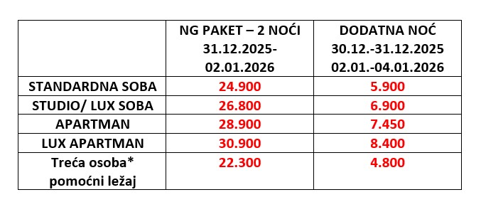 * cene NG PAKETA su po osobi i ne važe za jednokrevetne sobe