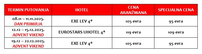 - transfer iz NOVOG SADA – doplata 20 evra / minimum 4 putnika, transfer iz VRŠCA – doplata 20 evra / minimum 8 putnika