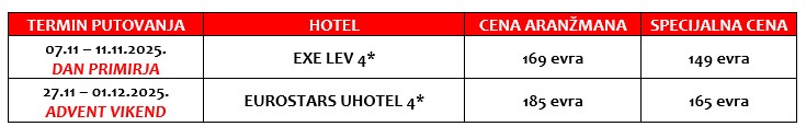- transfer iz NOVOG SADA – doplata 20 evra / minimum 4 putnika, transfer iz VRŠCA – doplata 20 evra / minimum 8 putnika