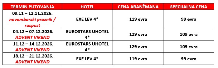 Hotel EXE LEV 4* Hotel se nalazi u centru grada, oko 800 metara od čuvenog Tromostovja. Hotel ima aperitiv bar, restoran… Sobe su sa TWC, TV, klima, telefon… Sobe su 1/2 i 1/2+1 (treći krevet je pomoćni ležaj manjih dimenzija tj sofa na razvlačenje i ne preporučujemo za odraslu osobu – isključivo na upit). Doručak je na bazi švedskog stola – samoposluživanje. www.exelev.com/?referer_code=lb0gg00yx