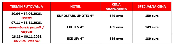 - transfer iz NOVOG SADA – doplata 20 evra / minimum 4 putnika, transfer iz VRŠCA – doplata 20 evra / minimum 8 putnika