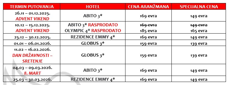 - Organizator zadržava pravo da putem Last minute ponude prodaje svoje aranžmana po cenama koje su drugačije od onih u cenovniku. Stranke koje su započele plaćanje ili uplatile aranžman po cenama objavljenim u ovom cenovniku nemaju pravo da potražuju nadoknadu na ime eventualne razlike u ceni.