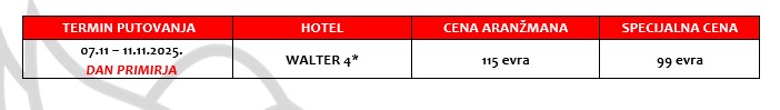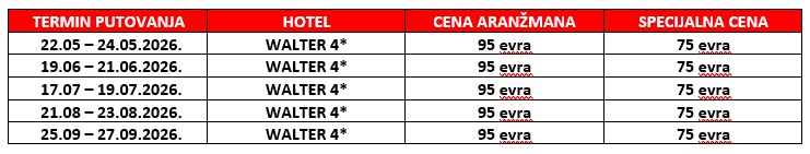 - transfer iz NOVOG SADA – doplata 20 evra / minimum 4 putnika, transfer iz VRŠCA – doplata 20 evra / minimum 8 putnika