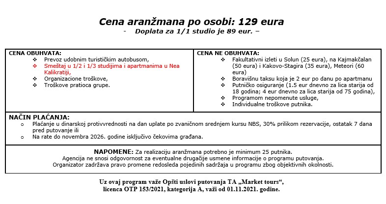 VAŽNO: Ministarstvo turizma Republike Grčke je najavilo uvođenje boravišne takse (turističke takse) od 01.01.2025. godine. Boravišna taksa u studijima/apartmanima iznosiće 2 eur dnevno po smeštajnoj jedinici i naplaćivaće je na licu mesta vlasnici smeštajnog objekta. Cene, doplate i uslovi prodaje su na sajtu čisto informativnog karaktera za sve informacije proverite zvaničan program putovanja Grčka – leto – 2026 – Halkidiki.
