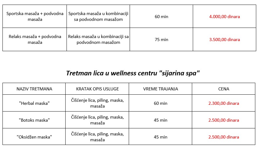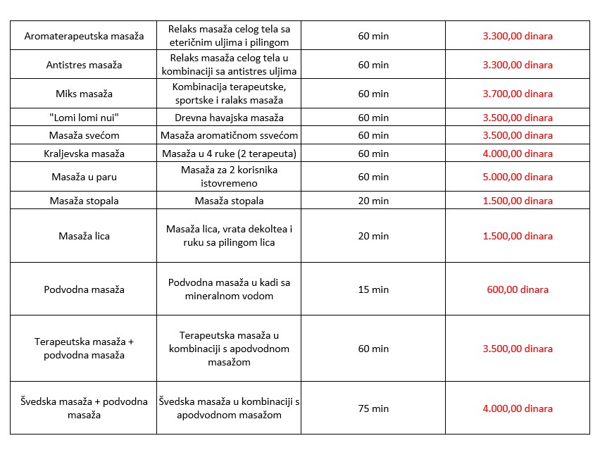 • BO dan: smeštaj, ishrana, 3 fizikalne terapije po preporuci lekara, gratis korišćenje bazena u zatvorenom prostoru, korišćenje bazena na rehabilitaciono rekreacionom kompleksu bazena “Gejzer”, pijanje vode sa mineralnih izvora