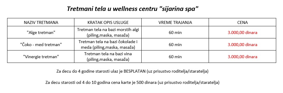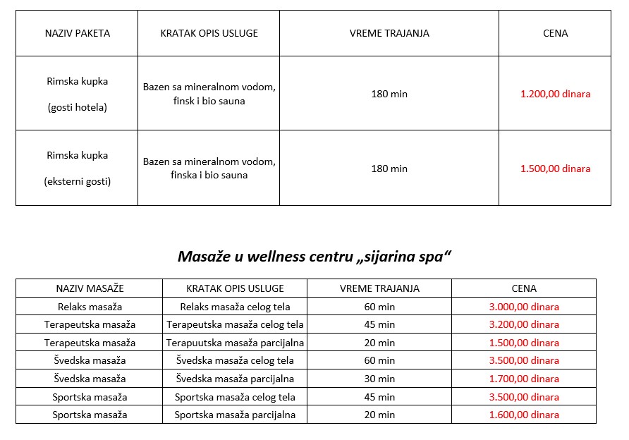 • WELLNESS dan: smeštaj, ishrana, Rimska kupka, (finska i bio sauna, ležaljka, bazen u SPA centru u trajanju od 180 min)