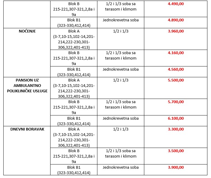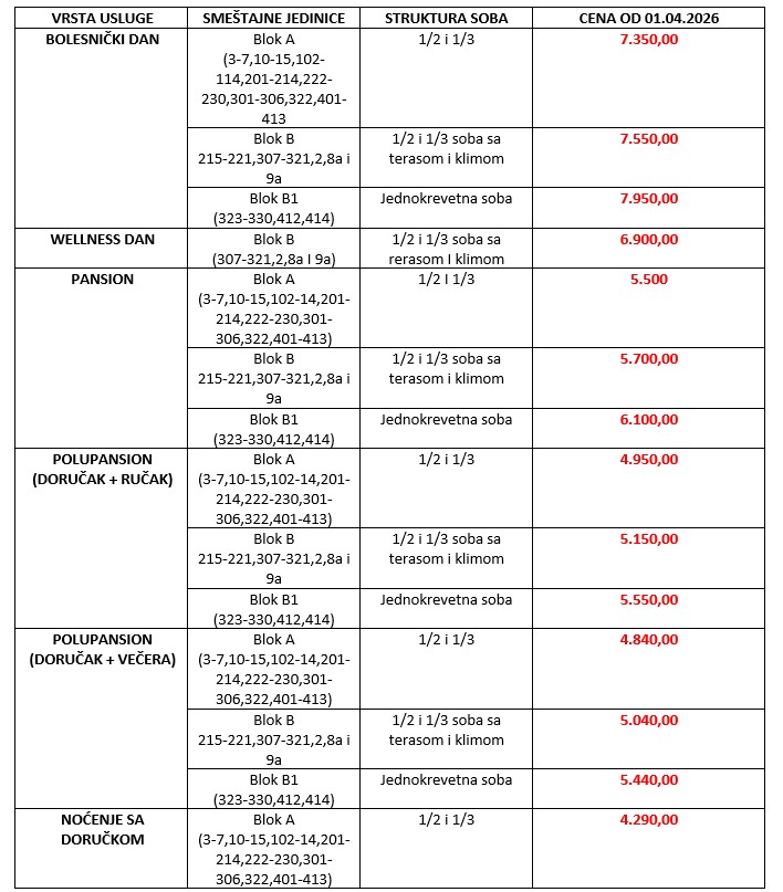 • Doplata za jednokrevetnu sobu: 600 dinara (blok A i B)