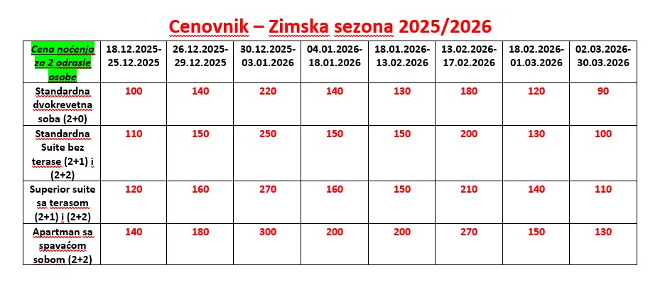 - 1. dan – Novi Sad – Kopaonik. Dolazak u hotel i smeštaj u sobe / apartmane posle 16.00h