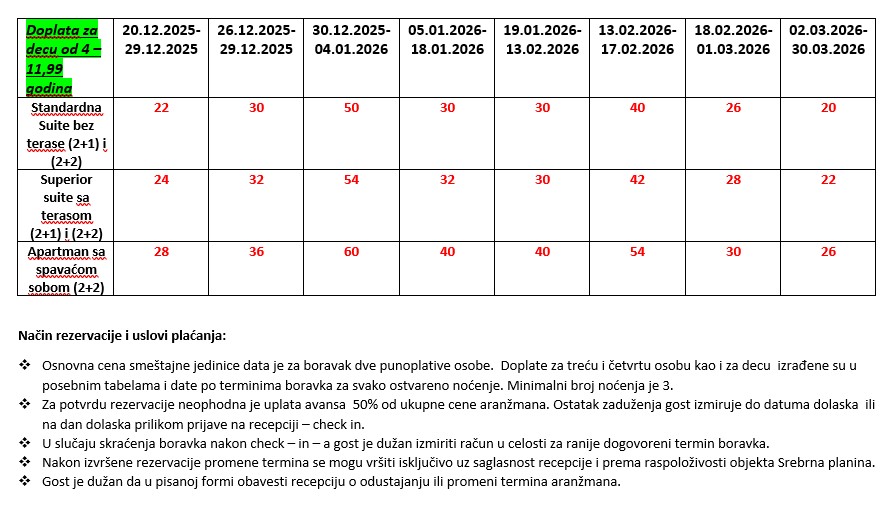 - Boravišna taksa 150,00 dinara. Deca do 7 godina ne plaćaju boravišnu taksu, deca od 7 – 15 godina plaćaju boravišnu taksu 75,00 dinara