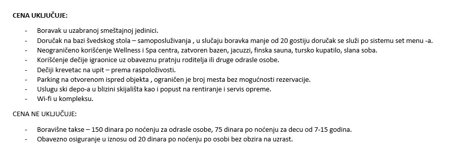 Cena aranžmana ne uključuje, ako nešto drugo nije posebno ugovoreno (dalje: Poseban ugovor), troškove: lokalnog turističkog vodiča, posebne usluge predstavnika organizatora, turističkog animatora, fakultativnih programa, korišćenja ležaljki i suncobrana, pribavljanja viza, ulaznica u objekte i na manifestacije, osiguranja putnika i prtljaga, usluga room service, korišćenja sobnog bara, klima uređaja, rekreativnih, lekarskih, telefonskih i dr. usluga, rezervaciju posebnog sedišta u prevoznom sredstvu, troškove smeštaja u jednokrevetnoj sobi, sobe sa posebnim karakteristikama (pogled, sprat, veličina, balkon, itd), dodatni obroci i dr. (dalje: Posebne usluge).