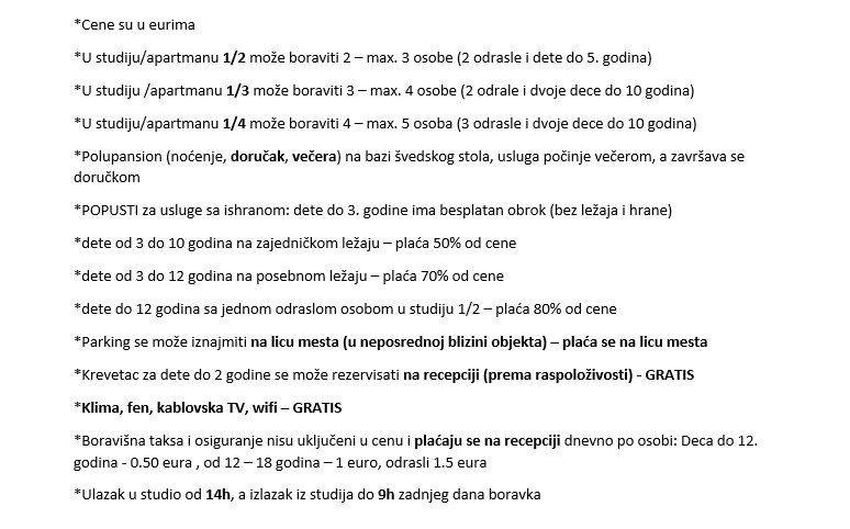 Napomena: Boravišna taksa i osiguranje nisu uključeni u cenu i plaćaju se dodatno na recepciji dnevno po osobi: