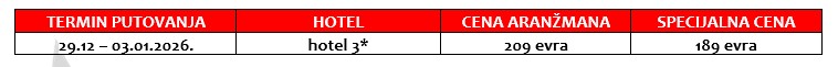 Organizator zadržava pravo da putem Last minute ponude prodaje svoje aranžmana po cenama koje su drugačije od onih u cenovniku. Stranke koje su započele plaćanje ili uplatile aranžman po cenama objavljenim u ovom cenovniku nemaju pravo da potražuju nadoknadu na ime eventualne razlike u ceni.