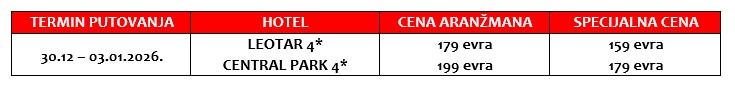• Organizator zadržava pravo da putem Last minute ponude prodaje svoje aranžmana po cenama koje su drugačije od onih u cenovniku. Stranke koje su započele plaćanje ili uplatile aranžman po cenama objavljenim u ovom cenovniku nemaju pravo da potražuju nadoknadu na ime eventualne razlike u ceni.