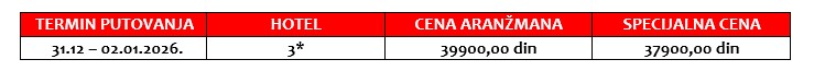 - transfer iz NOVOG SADA – doplata 2500,00 din / minimum 4 putnika, transfer iz VRŠCA – doplata 2000,00 din / minimum 8 putnika